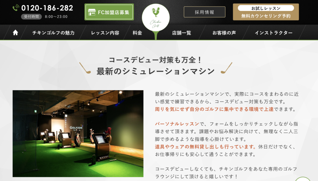 チキンゴルフは楽しくなければゴルフじゃないと言い切っているまさにゴルフ好きのためのゴルフスクールです。最新シミュレーションによる映像と癖や欠点を見抜き適切なアドバイスをくれるインストラクターによるパーソナルレッスンで短期間にスコアアップが目指せます。